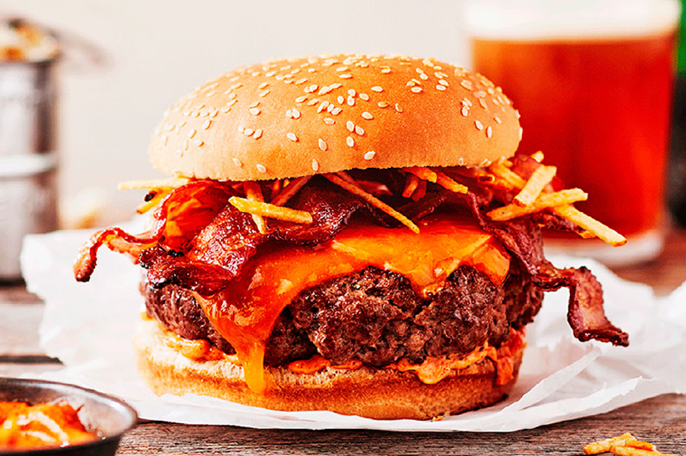(BBQ Burger)A bold BBQ favourite – smoky barbecue sauce, tangy pickles, fresh lettuce, tomato, and smooth American cheese, all stacked for that perfect smoky-sweet balance. Choice of Beef patty or crispy chicken fillet.